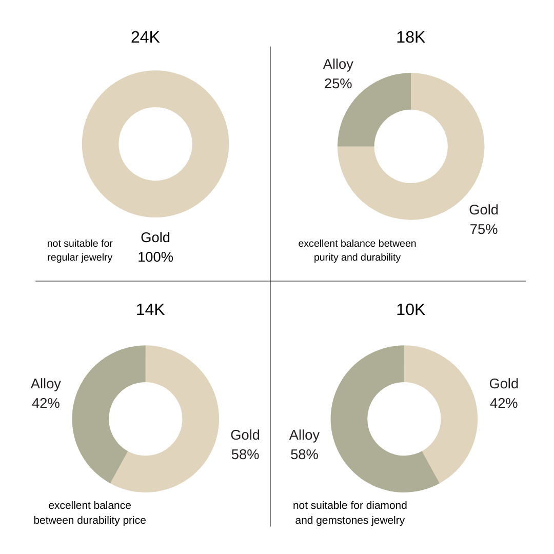 As a starting point, it helps to understand that one hundred percent pure gold is 24 karat gold. Karats are a measure to describe the percentage of gold purity in a piece of fine jewelry. Because 24k gold is soft, it is not ideally suited for everyday jewelry, and for that reason, pure gold is mixed with other alloys to create the best quality composition for your jewelry.